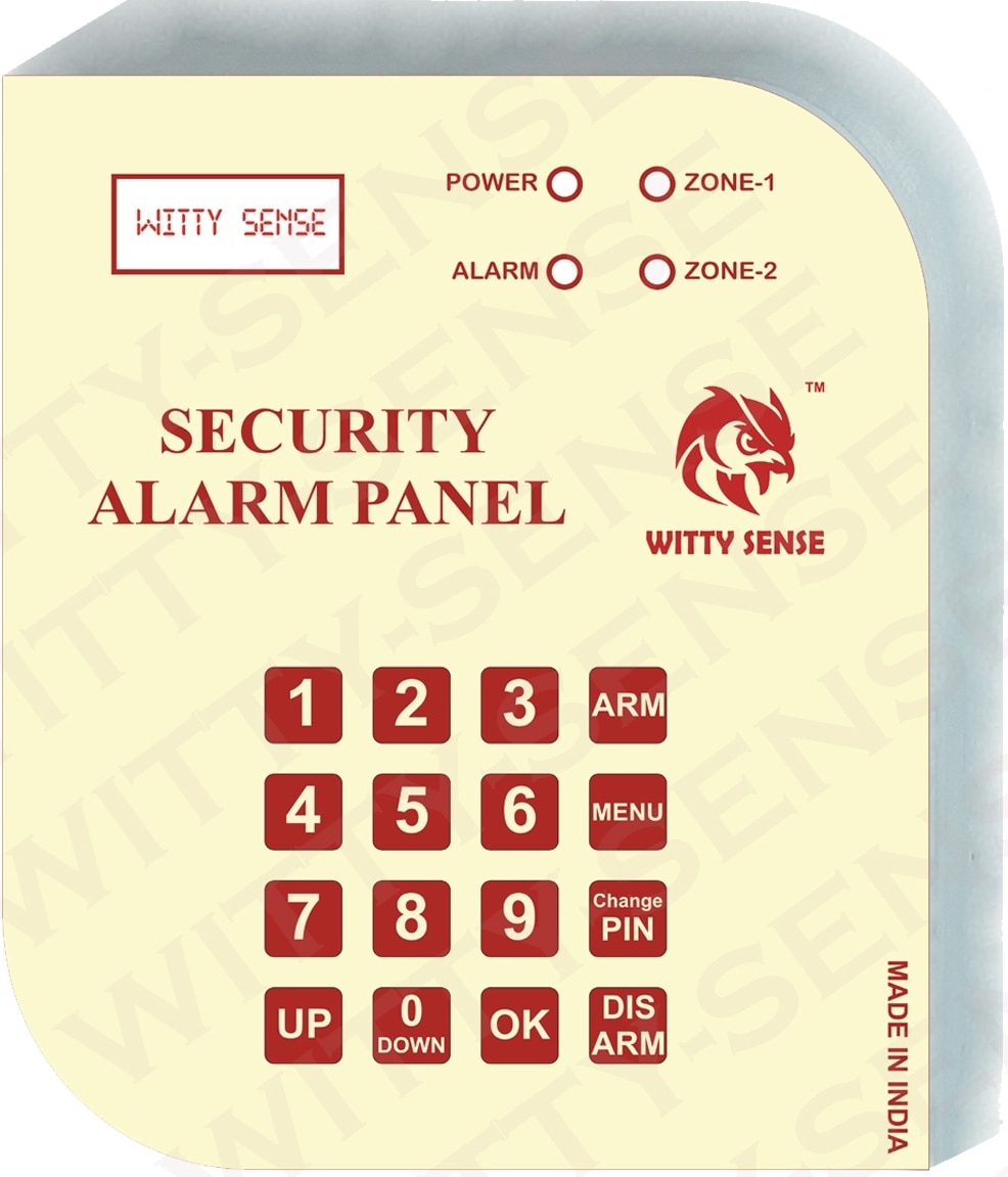 Security Alarm Panel Model No.: AP-H2ZR Witty Sense Logo & Branding Features: Designed With Original Micro-controller for more reliability. User Friendly Configurations/Operations. Hybrid Alarm Panel means connect Wired & Wireless Sensor Both. Connect up to 10 Wireless Sensors with Panel. Auto Armed & Disarmed With Timer Function. Easy to Install Design. Wireless Remote Key for Arming & Disarming. Onboard Key-Pad & 4 digit Display for Easy Settings. One Delay Zone for Entry And Exit. 4 Digit Password Protected. Configurable Delay Zone. Open Zone Indication by LED.